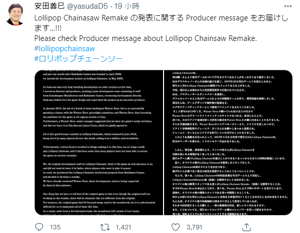由日本 Dragami Games 曾在 PS3 / Xbox 360 平台上推出的丧尸题材动作游戏作品《Lollipop Chainsaw》于近期迎来十周年纪念后,社长安田善巳近日更是宣布本作将推出重制版的消息,并表示游戏预定在 2023 年推出,开发团队依旧由 Dragami Games 负责,这部也将作为《Lollipop Chainsaw》十周年纪念作。至于游戏将会登陆什么平台目前还未公布,得等官方更进一步的发表才能知晓。