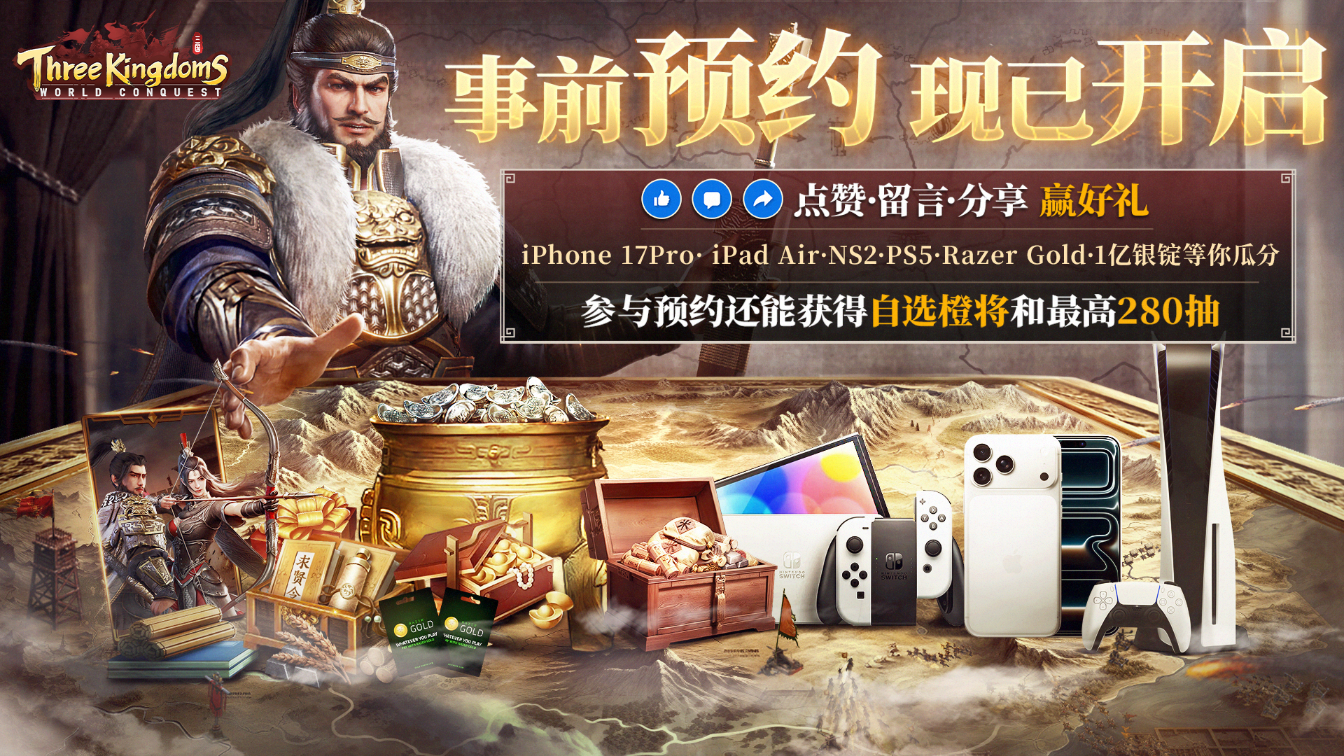 预约即送专属好礼,3C豪礼待领取!即日起参与事前预约,即可选择获取东南亚限定大象或老虎主题主城外观,并有机会累计获得最多280抽的招募机会!助力玩家早日集结强力阵容,征战三国。