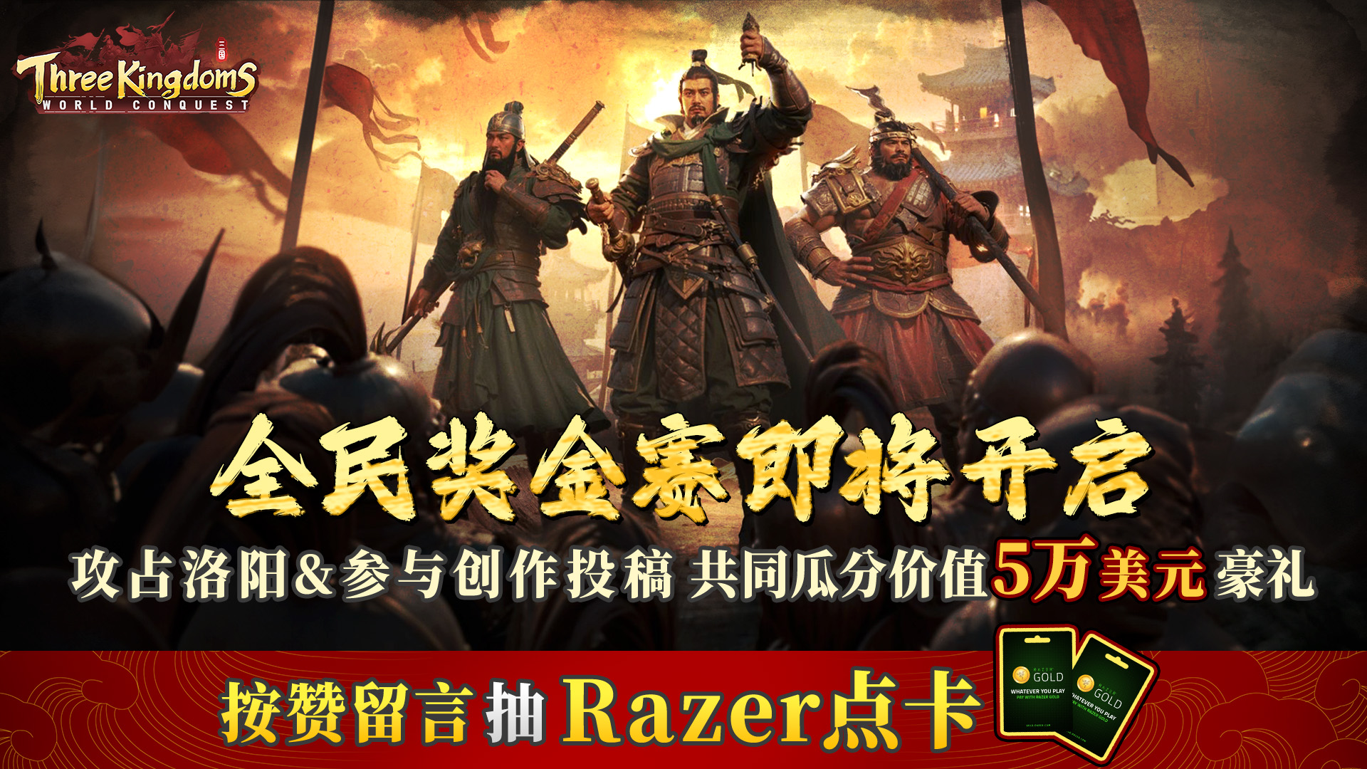 游戏上线后,《Three Kingdoms: World Conquest》将推出“全民奖金赛”大型赛事活动。玩家不仅可通过参与攻占洛阳、长安等竞速玩法赢得奖池份额,还可通过参与游戏内容征集活动投稿获得额外奖励。